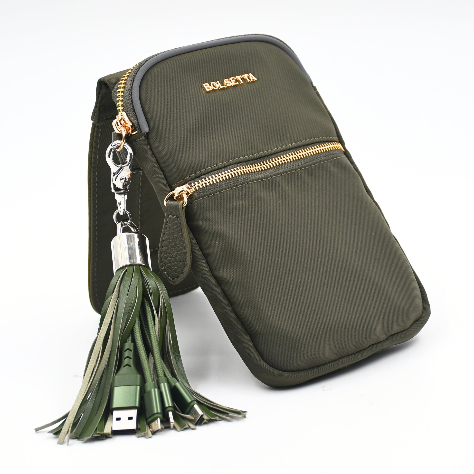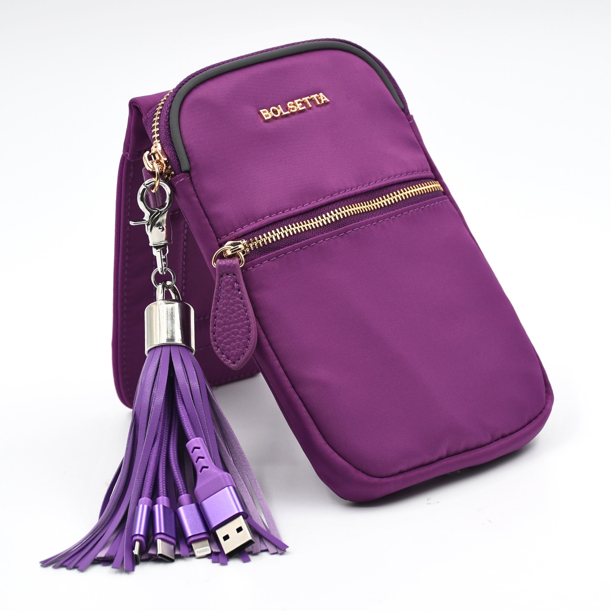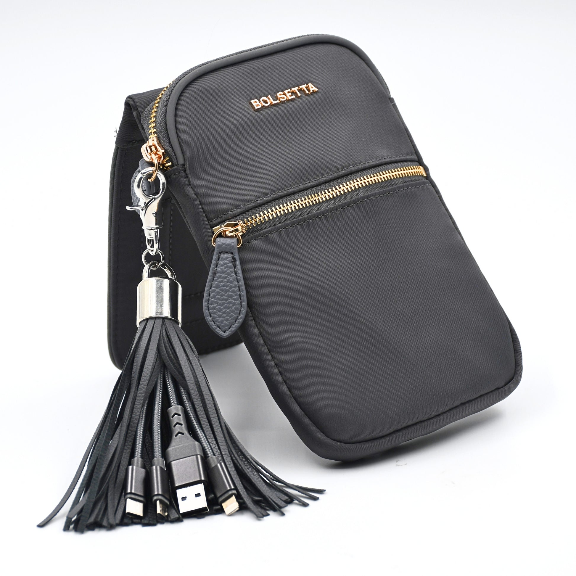 Comes with a matching Bolsetta Charging Tassel featuring 3-in-1 compatibility (Apple Lightning, USB-C, and Micro-USB). Plug in anytime to stay charged through your day—no bulky cables needed.