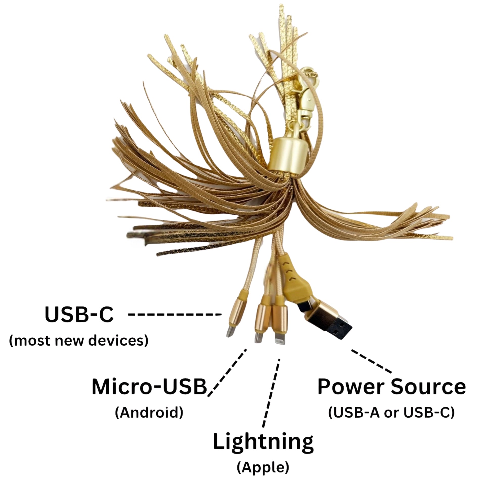 • 3-in-1 Charging Tassel – USB-A to Lightning / USB-C / Micro-USB